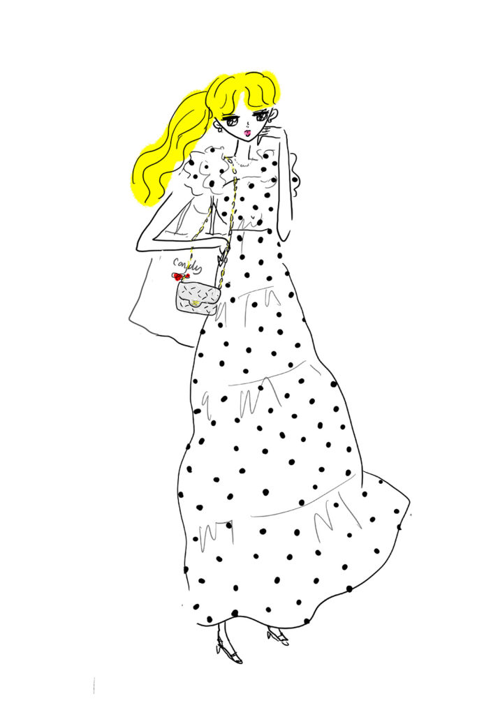 この夏トレンドのポルカドット柄。デートにはこのくらいスウィートなラッフルフリルのドレスもおすすめ♡ 甘すぎるかなと感じたら、はずしアイテムの70sサングラスでモードに。