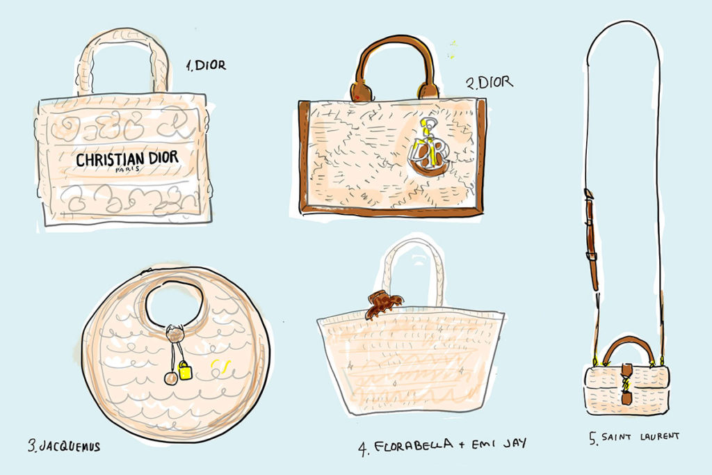 代表的なものは、ピクニックで使うカゴバッグや、白雪姫のりんごが入ったバスケットなど。この中では、水色の線で囲んだサン・ローランのバニティバッグが、ウィッカーバッグです。