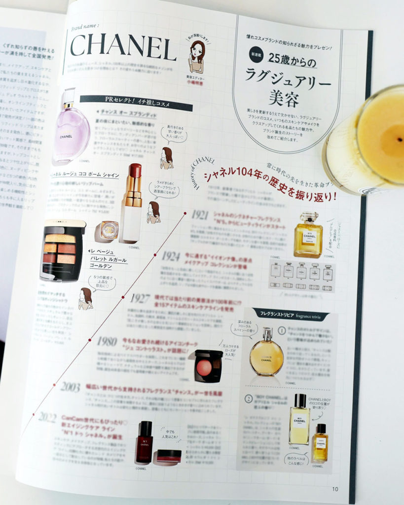 「CanCam」8月号から始まった「25歳からのラグジュアリー美容」。わたしは、美容エディターさんの似顔絵を描かせていただきました。記念すべき第1回目はCHANELです。