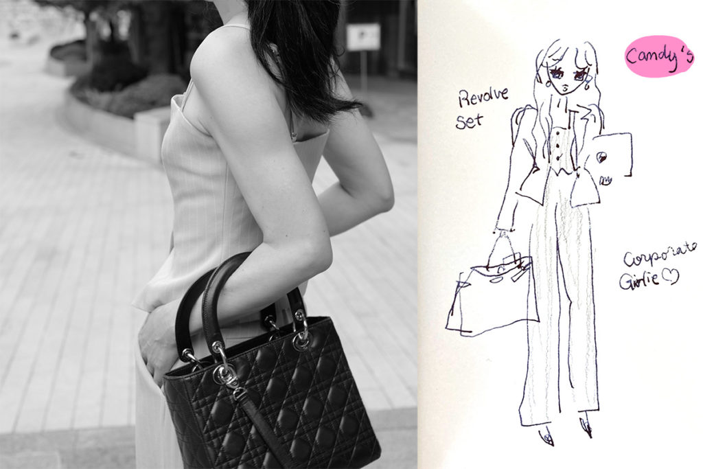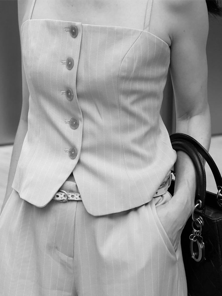 この日のコーデは、セットで同素材のパンツを合わせました。生地は、薄くてハリがあって、シワになりにくく、フロント部分のボタンやストラップの小さな金具は、ほどよい高級感が嬉しいお洋服です。