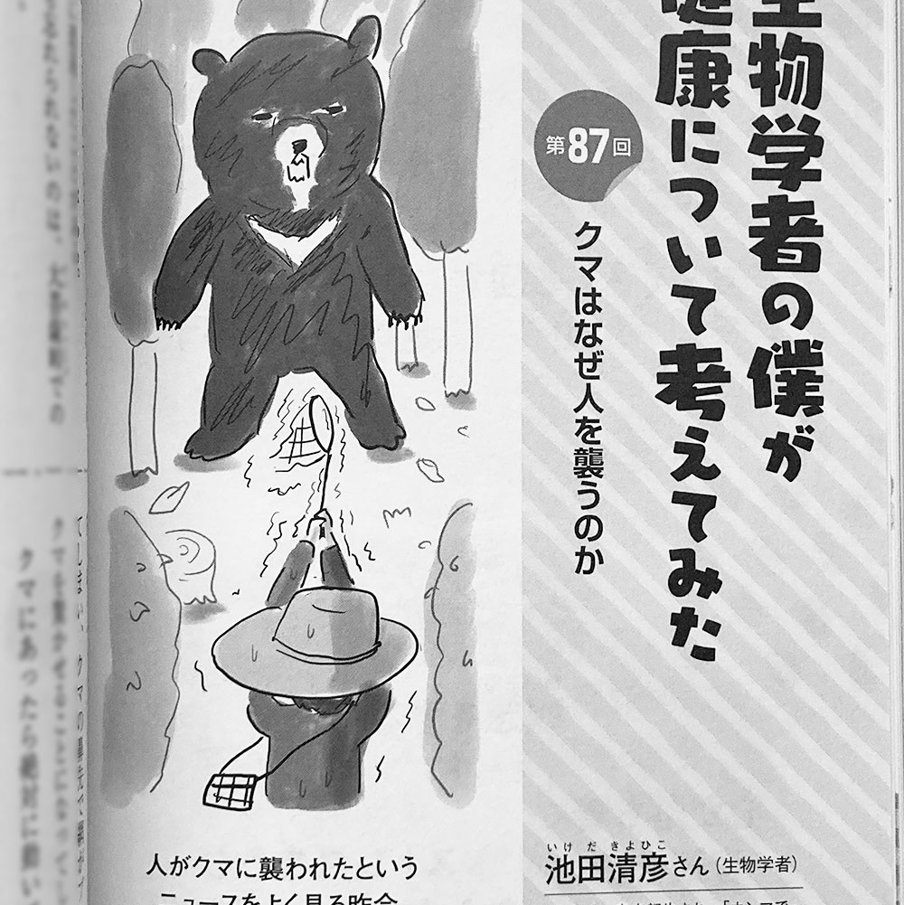 「PHPからだスマイル」池田清彦先生の連載挿絵のお仕事で、可愛い動物イラストが増えてきました。そこで今回は、池田先生がクマに襲われそうになったお話なども一緒に動物イラストをご紹介しますね!